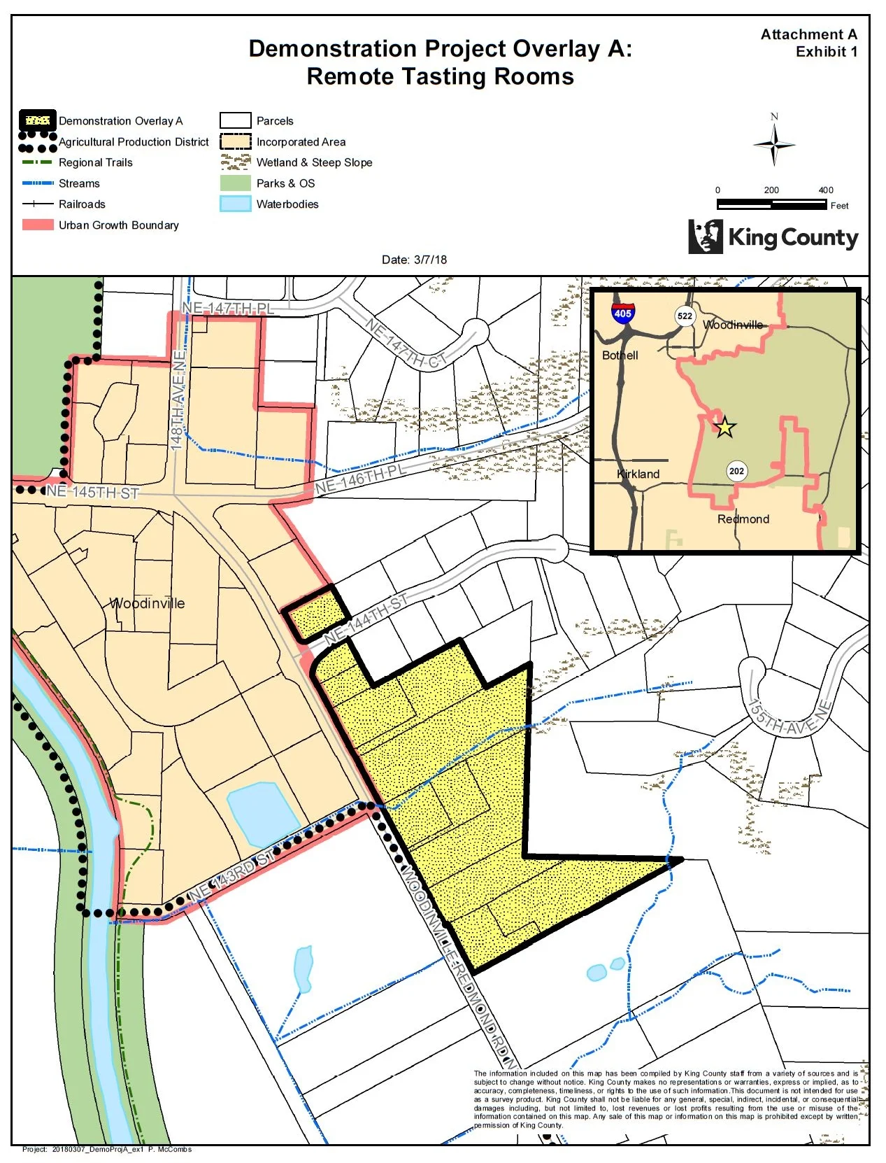 The map above (Demonstration Project Overlay B) and below (Demonstration Project Overlay A) show the area along the east side of Redmond-Woodinville Rd between NE 124th St to the south and the Woodinville Tourist District to the north, which would be opened to urban, commercial use remote tasting rooms and event centers.