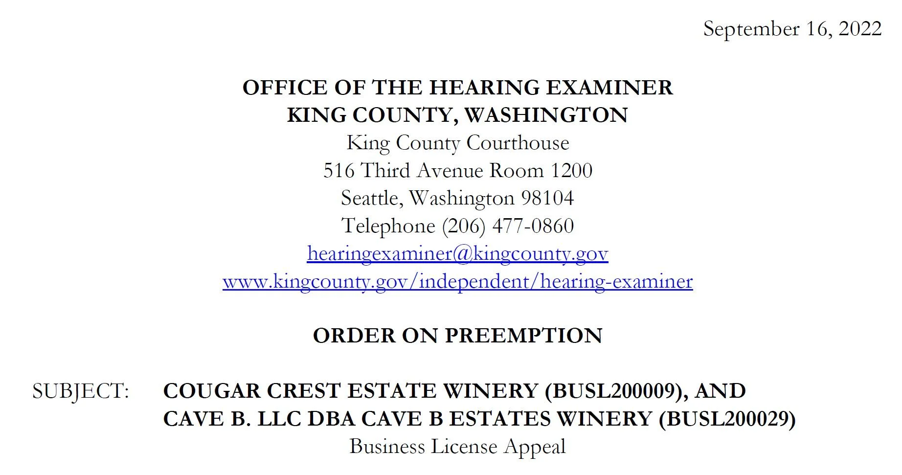 The Hearing Examiner ruled on September 16, 2022 that he cannot rule on the Cave B / Cougar Crest Motion on Preemption as it is outside his jurisdiction, as FoSV had correctly argued in our opposition.
