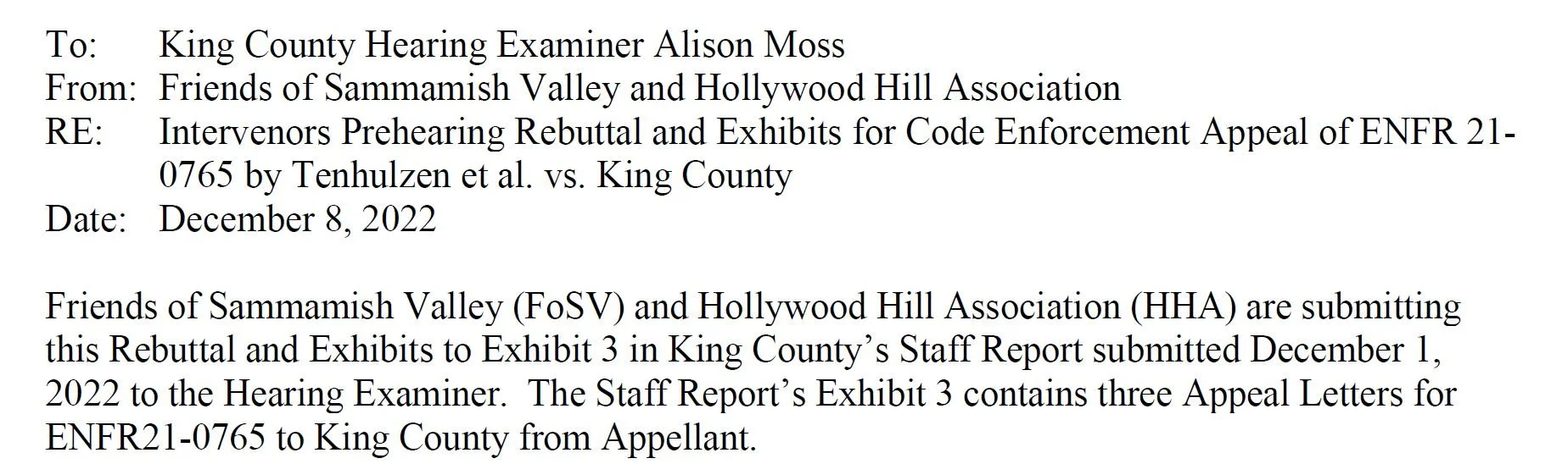 FoSV and Hollywood Hill Association were granted intervenor status in this Hearing Examiner case, which allowed us to submit the below rebuttal to statements made by Tenhulzen about the history and use of their property.
