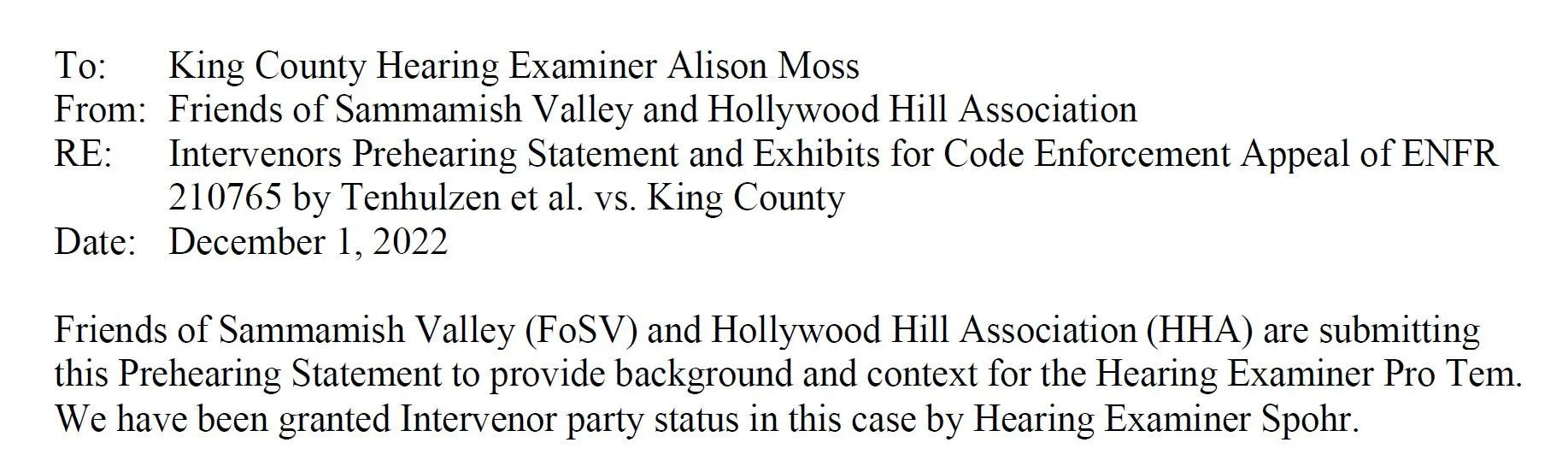 FoSV and Hollywood Hill Association were granted intervenor status in this Hearing Examiner case, which allowed us to submit the below statement with history, facts, and arguments to support King County’s effort to code enforce against the illegal activities on the property.
