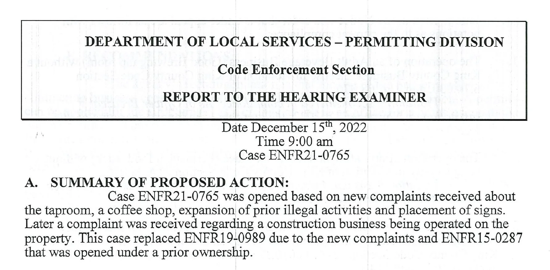 King County initially submitted the below report to the Hearing Examiner on December 1, 2022 in response to Tenhulzen's appeal of KC code enforcement actions on illegal activities on the Tenhulzen property. The document was updated on December 15 to correct for pages that went missing in the scanner.