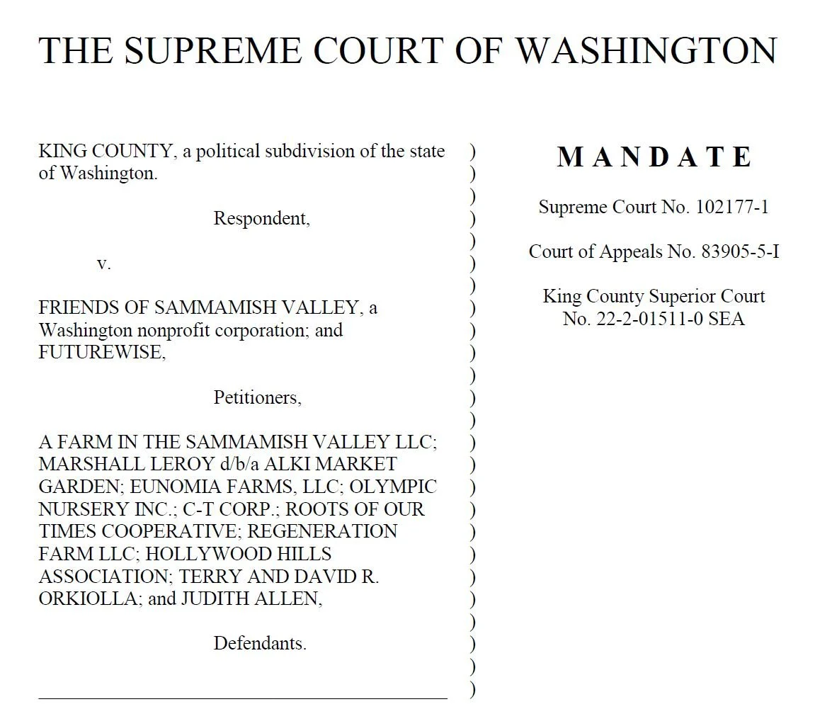King County declined to file for reconsideration of the WA State Supreme Court decision. So on October 10, 2024 the Supreme Court sent their mandate to the Superior Court notifying them officially of their decision to uphold the Growth Management Hearings Board.