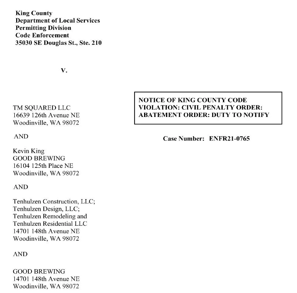On April 28, 2022 King County Department of Code Enforcement sent a Notice and Order (N&O) to Tenhulzen Construction and Good Brewing that they must cease operations of their commercial businesses located at 14701 148th Ave NE by May 31, 2022. Both businesses failed to comply with prior citations. A N&O is the last citation before the case goes to the hearing examiner and the courts.